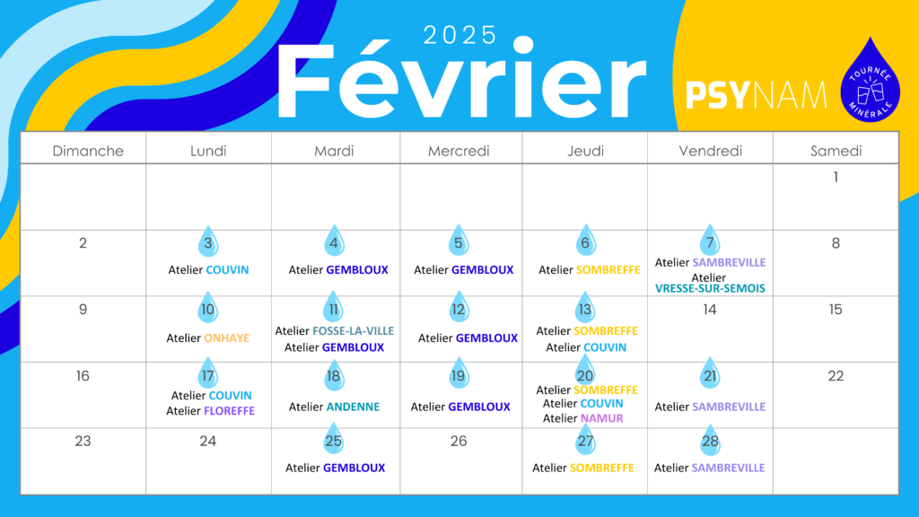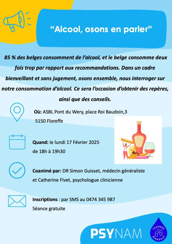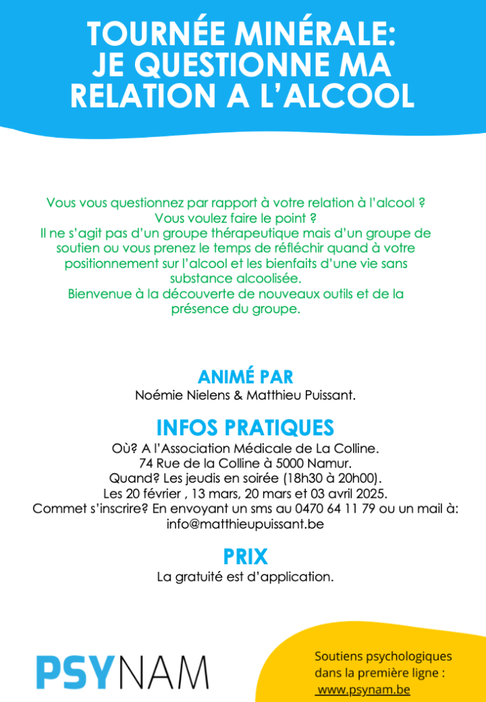PSYNAM s’engage pour la première année à l’occasion de la Tournée Minérale® en proposant une série d’ateliers et conférences participatives sur les enjeux de la consommation d’alcool. Ces événements, animés par des psychologues conventionné.e.s PSYNAM, s’adressent au grand public et visent à ouvrir le dialogue sur un sujet parfois délicat, tout en offrant des outils concrets pour promouvoir la santé mentale et physique.