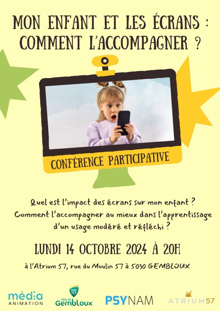 - Mon enfant et les écrans : comment l’accompagner ? Xavier SCHMITZ, psychologue et Bérénice VANNESTE, chargée de projets chez Média Animation ASBL vous proposeront une approche déculpabilisante pour guider vos enfants vers un usage modéré et réfléchi des écrans.