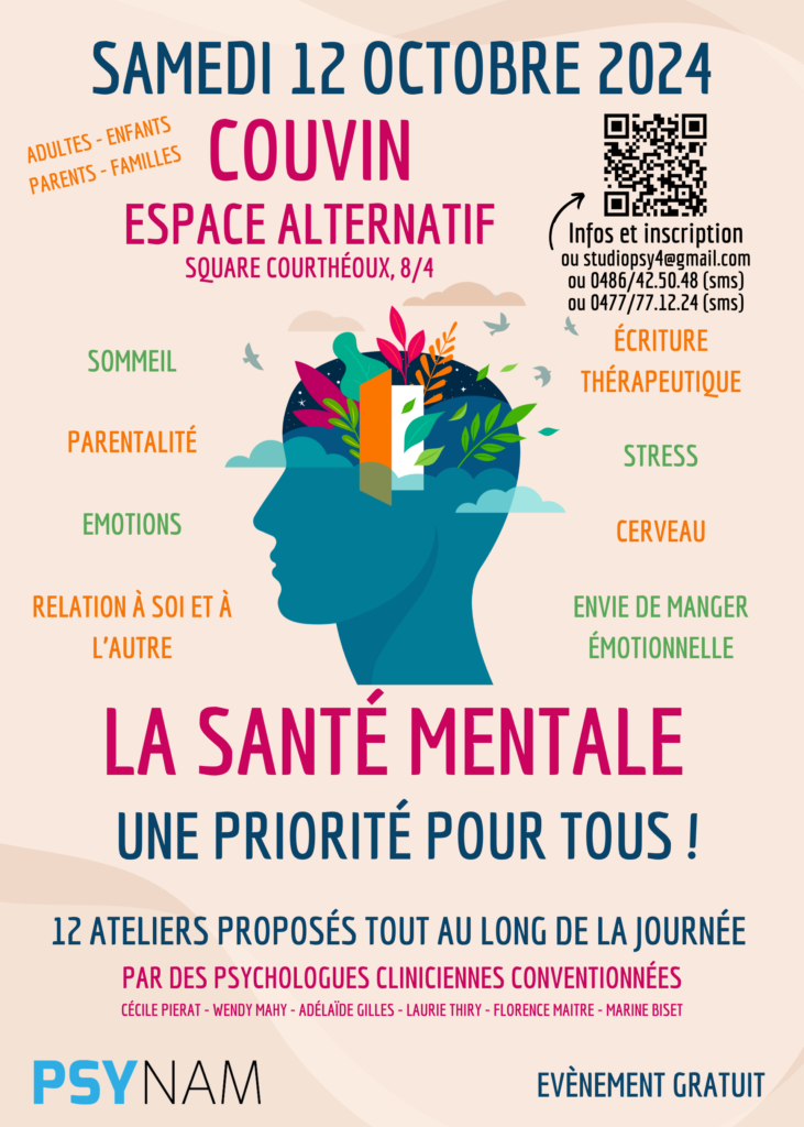 - La santé mentale une priorité pour tous ! : 12 ateliers proposés tout au long de la journée par des psychologues cliniciennes conventionnées. Animés par Marine Biset, Wendy Mahy et Laurie Thiry avec l’Espace Alternatif de Couvin
