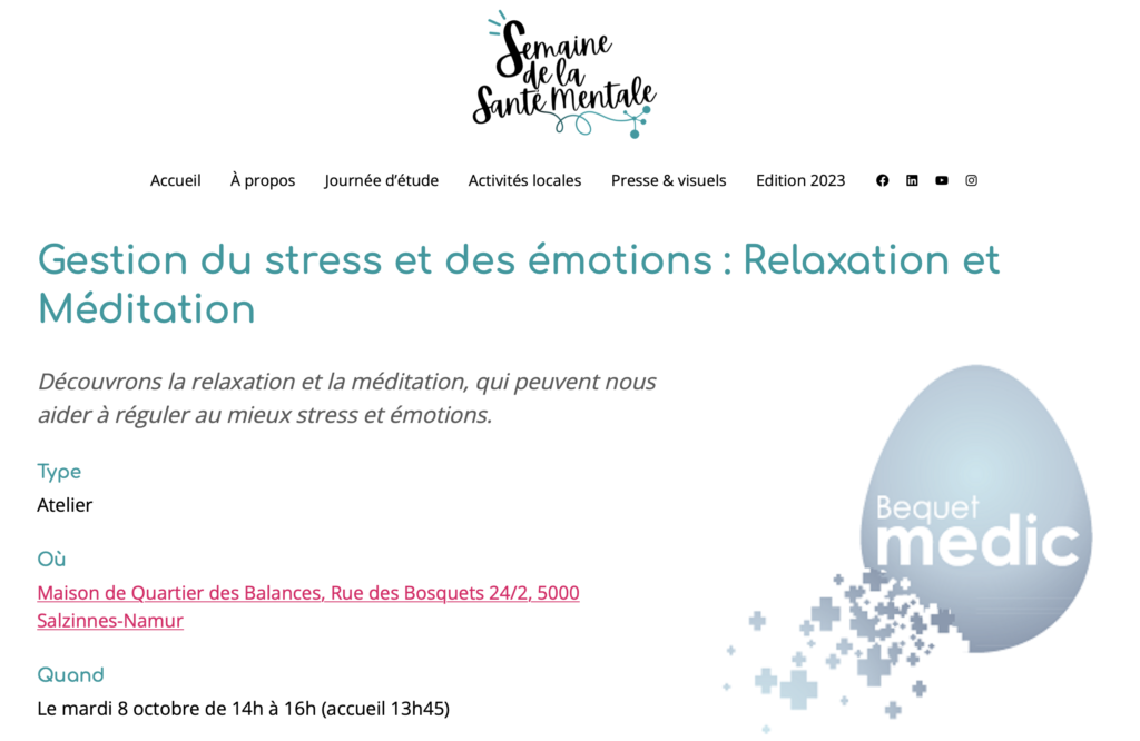 - Gestion du stress et des émotions : Relaxation et Méditation Amandine Bauwens, médecin généraliste et Marc Minet, psychologue proposeront un atelier de 2h avec la Maison de quartier des balances