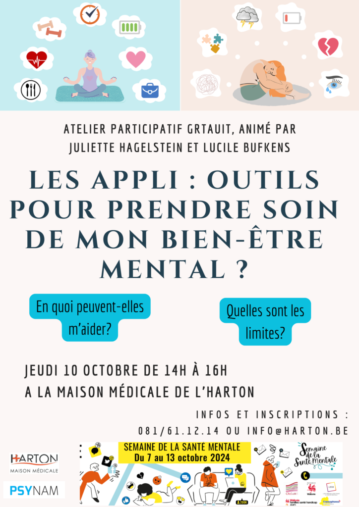 - Les appli : outils pour prendre soin de mon bien-être mental ? Atelier participatif gratuit animé par Juliette Hagelstein et Lucile Bufkens avec la Maison Médicale de l’Harton