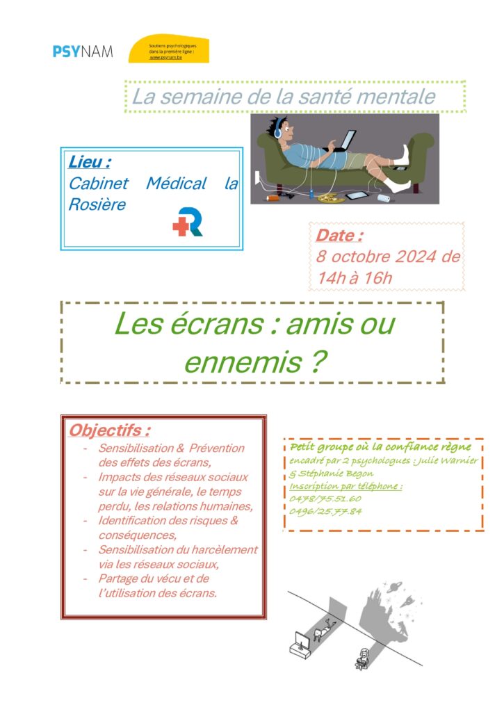 - Usage problématique des écrans : Conférence animée par Jory Deleuze (Docteur en psychologie et psychothérapeute spécialisé) avec le CHRSM – site Sambre